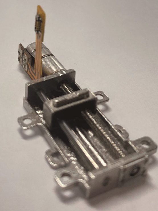 「GR-1」は、超小型・高推力・ロングストローク(17mm)のリニア駆動ギヤードモータ。駆動電圧±5V、抵抗値14Ω/±10%、モータステップ角度18度、推力2.45N以上、移動速度13.2mm/s。サイズ35x11x5mm。
