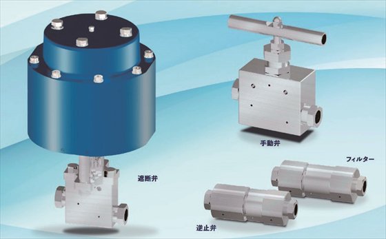 遮断弁、手動弁、逆止弁、フィルターなど、超高圧水素向けの機器シリーズ。ボディ材質に、Ni当量28.5以上、絞り75%以上の非常に丈夫なステンレスSUS316を使用し、最高使用圧力99.9MPaに耐える。液体使用温度は-40〜+85℃に対応。