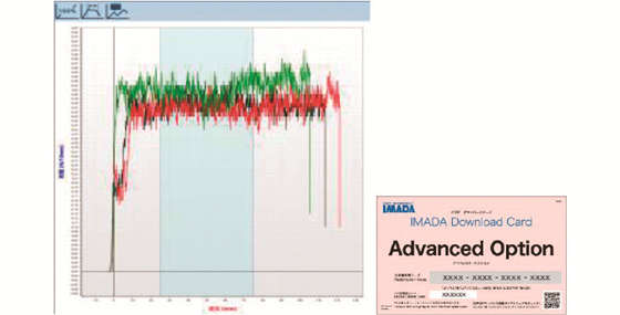 「剥離試験最適化機能(1)」はグラフ描画ソフトウェア「Force Recorder Nextシリーズ」用の追加機能。測定結果を剥離力単位に自動換算可能。90度/180度/T型の3つの試験法に合わせた規格が測定条件としてプリセット登録されている。